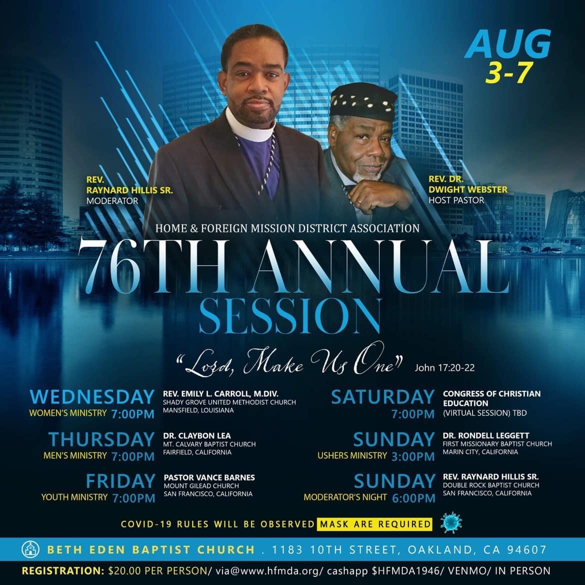 Please join us for an awesome week of spirit-filled preaching, teaching, and fellowship at the 76th Annual Session of the Home and Foreign Mission District Association. In-person and virtual options are available.